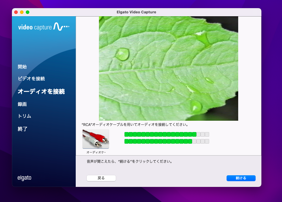 設定ができたら、「続ける」ボタンをクリックして次の画面に移動します。そうすると今度は画面表示の確認と音声の確認が出てきます。緑の2本のバーは音声のレベルを表しています。あくまで視覚的に音声がパソコンで認識されているかの確認画面なのでレベルや音量調整はできません。